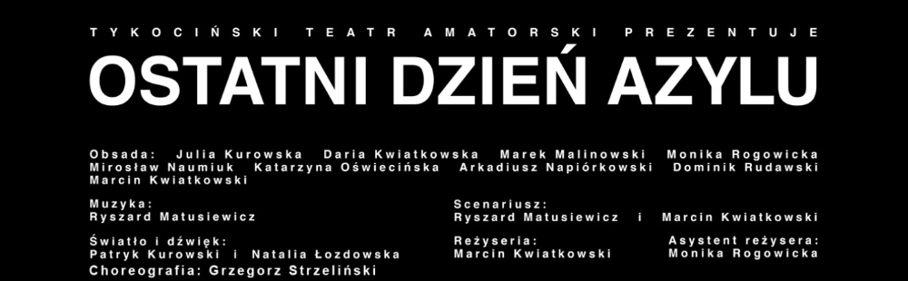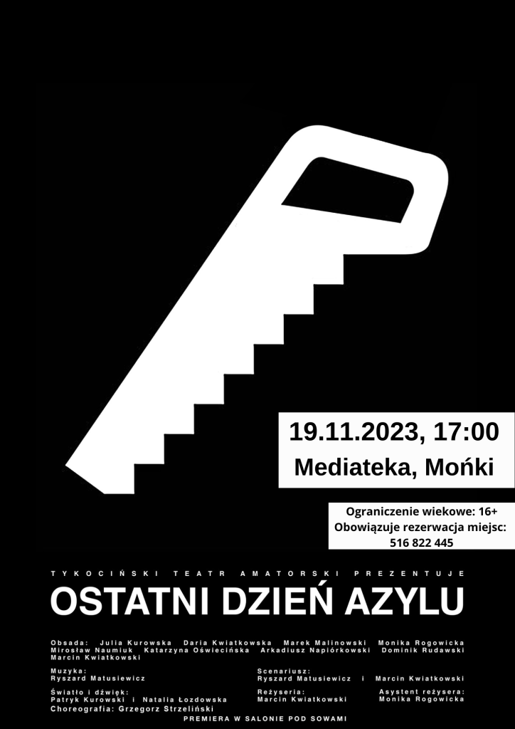 Zapraszamy serdecznie na niezwykłe doświadczenie teatralne pt. “Ostatni Dzień Azylu”, które zostanie zaprezentowane przez Tykociński Teatr Amatorski. Spektakl odbędzie się 19 listopada o godzinie 17:00, w Mediatece.