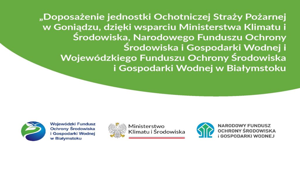 Ochotnicza Straż Pożarna w Goniądzu podpisała umowę na dofinansowanie realizacji przedsięwzięcia pod nazwą: „Doposażenie jednostki Ochotniczej Straży Pożarnej w Goniądzu”, z Wojewódzkim Funduszem Ochrony Środowiska i Gospodarki Wodnej w Białymstoku. W wyniku realizacji w/w zadania zakupiono sprzęt ratowniczo-gaśniczy dla Ochotniczej Straży Pożarnej w Goniądzu.