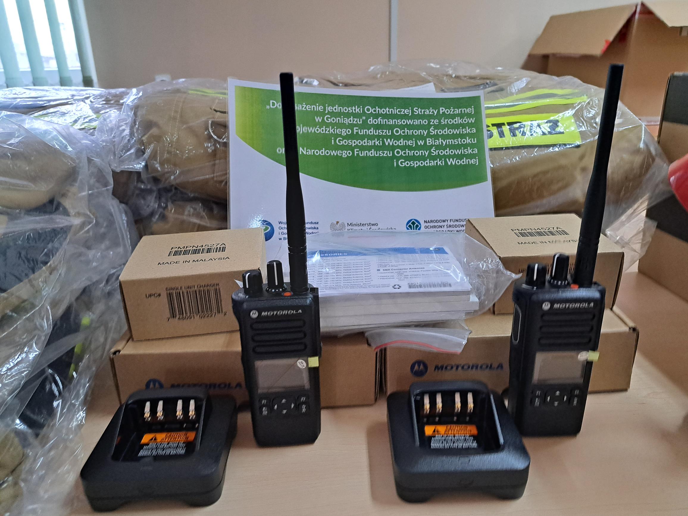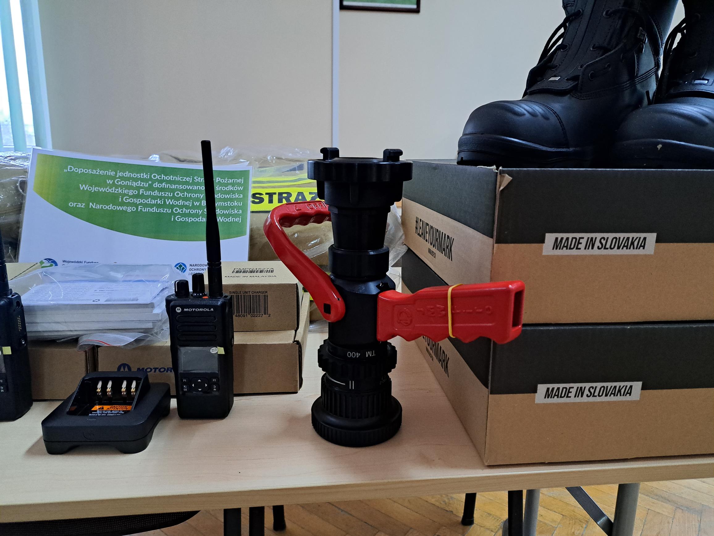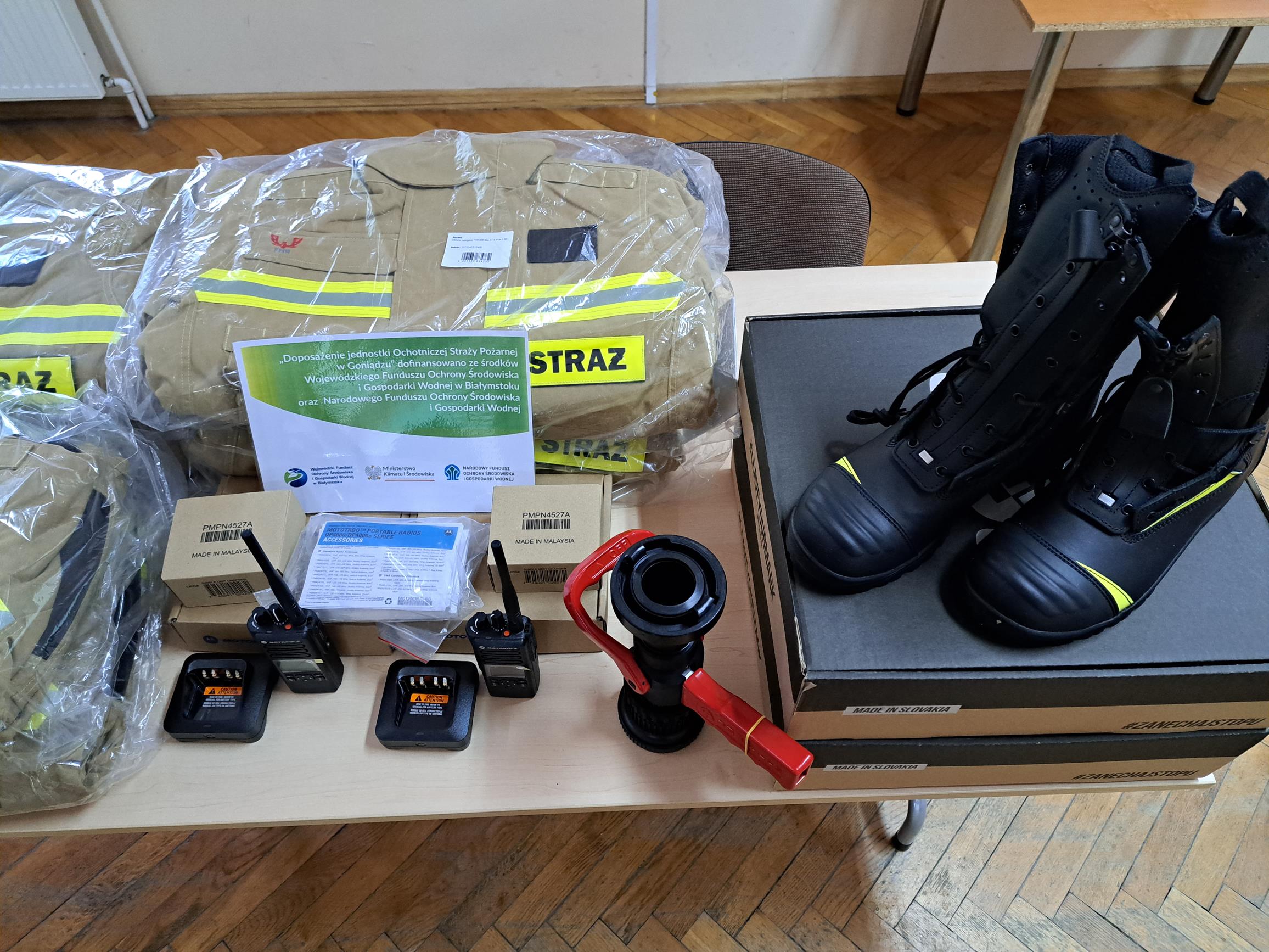 Jednostka OSP w Goniądzu zakupiła: ubrania specjalne – 6 kpl., buty specjalne strażackie skórzane – 2 pary, ubrania koszarowe – 5 kpl., radiotelefon przenośny – 2 kpl., ładowarka do radiotelefonu przenośnego – 2 szt., prądownica wodna – 1 szt.