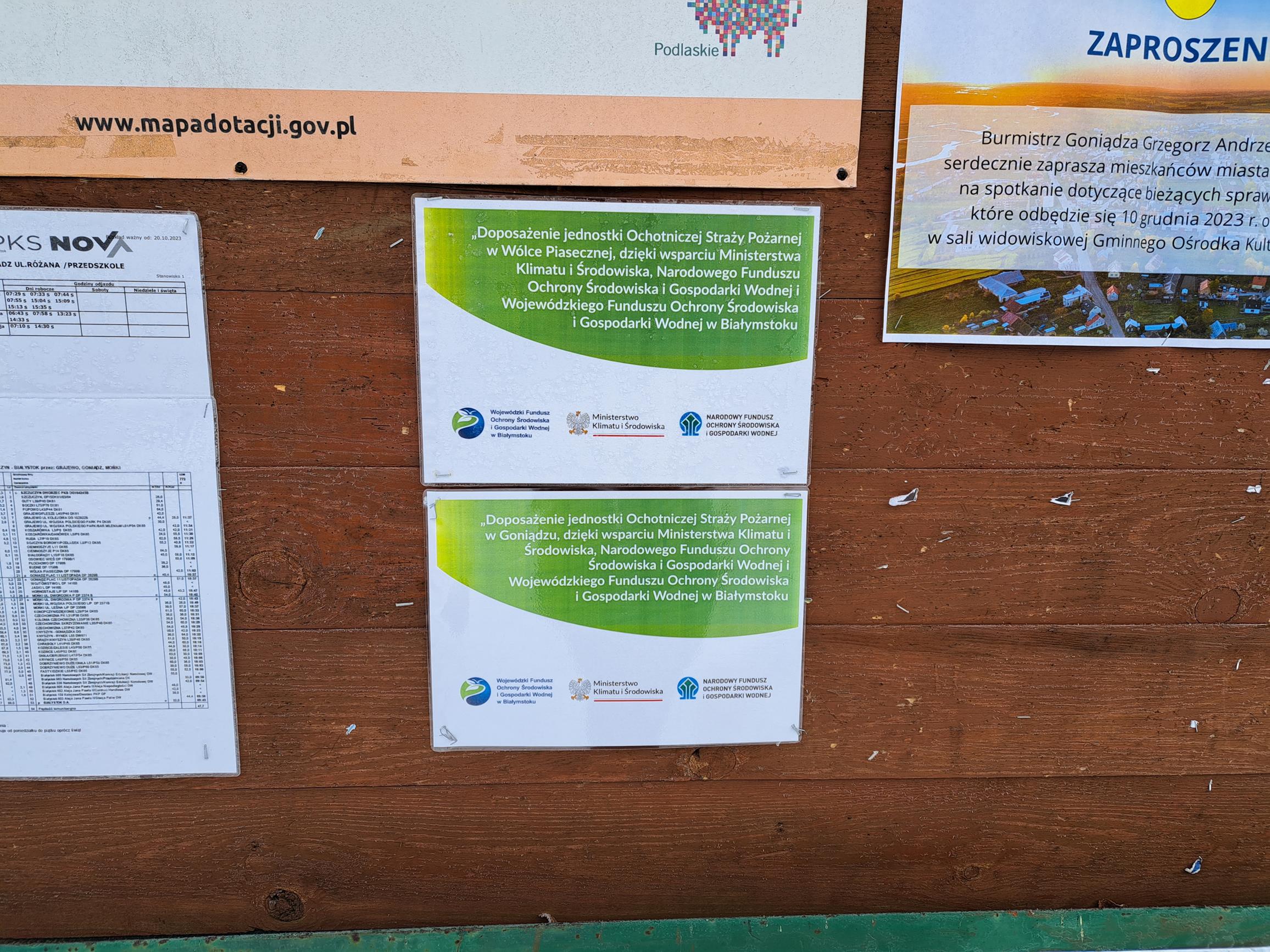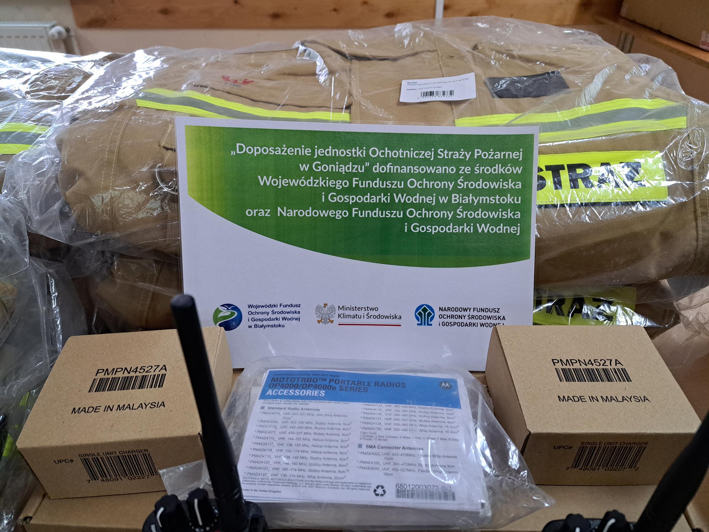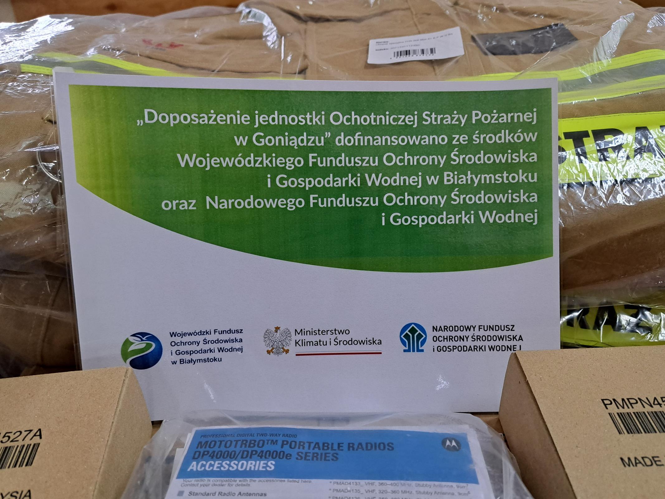 Ochotnicza Straż Pożarna w Goniądzu podpisała umowę na dofinansowanie realizacji przedsięwzięcia pod nazwą: „Doposażenie jednostki Ochotniczej Straży Pożarnej w Goniądzu”, z Wojewódzkim Funduszem Ochrony Środowiska i Gospodarki Wodnej w Białymstoku. W wyniku realizacji w/w zadania zakupiono sprzęt ratowniczo-gaśniczy dla Ochotniczej Straży Pożarnej w Goniądzu.