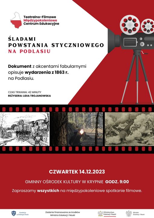 Aktualności 6 grudnia 2023 Pokaz filmu “Śladami Powstania Styczniowego na Podlasiu” w reżyserii Lidii Trojanowskiej 0 Udostępnij 0 tweet 0 udostępnij 0 udostępnij źródło: facebook.pl Poprzedni Artykuł Uchwała w sprawie zamiaru likwidacji samorządowej instytucji kultury – Filii… Następny Artykuł Konferencje “W zdrowym ciele zdrowy duch” w Parafii św. Brata…