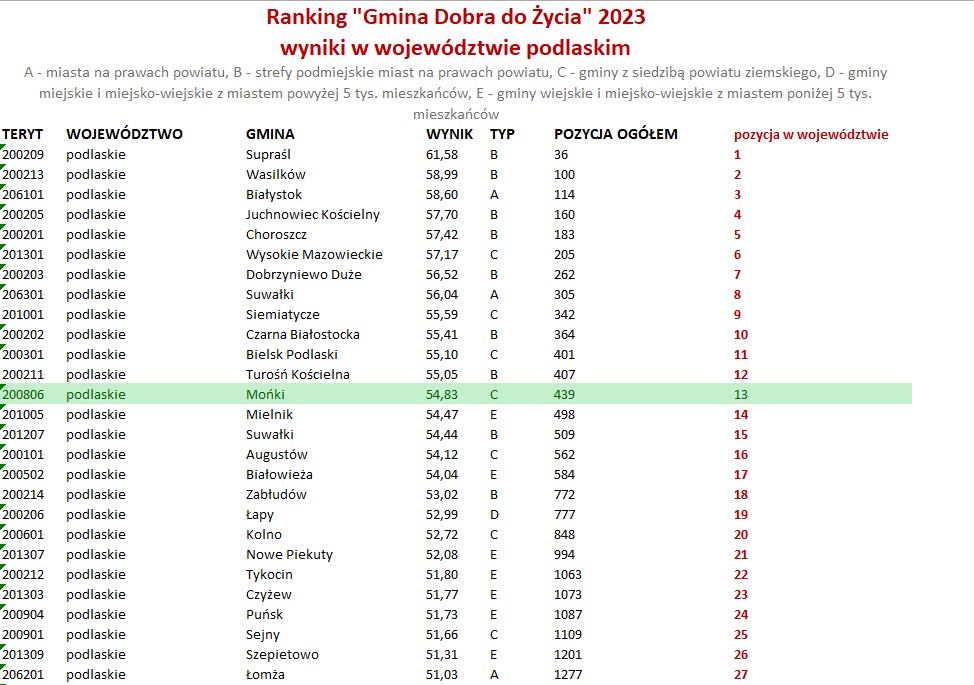 Gmina Mońki uzyskała 13. miejsce, co świadczy o efektywnej pracy samorządu na rzecz poprawy jakości życia mieszkańców. Wynik ten jest rezultatem skoordynowanych działań w obszarze inwestycji, edukacji, i infrastruktury, a także dbałości o rozwój społeczności lokalnej.
