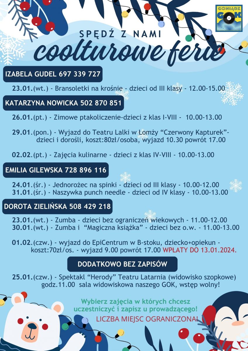 Zima to czas, gdy młodzi ludzie szukają sposobów na aktywne spędzenie ferii. W Gminnym Ośrodku Kultury w Goniądzu (GOK) przygotowano specjalną ofertę, która zachwyci najmłodszych uczestników. Pod hasłem “Cooltowe Ferie” zaplanowano różnorodne warsztaty i wyjazdy, które z pewnością dostarczą dzieciom niezapomnianych przeżyć.