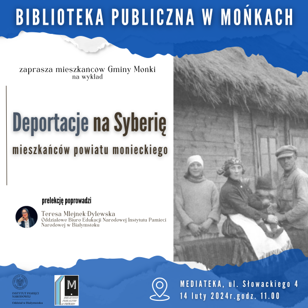 14 lutego 2024 roku o godzinie 11:00 Biblioteka Publiczna w Mońkach przy ul. Słowackiego 4 serdecznie zaprasza na wyjątkowy wykład pt. “Deportacje na Syberię mieszkańców powiatu monieckiego”. Spotkanie odbędzie się w Mediatece, a gościem specjalnym będzie Teresa Mlejnek-Dylewska z Odziałowego Biura Edukacji Narodowej Instytutu Pamięci Narodowej w Białymstoku.